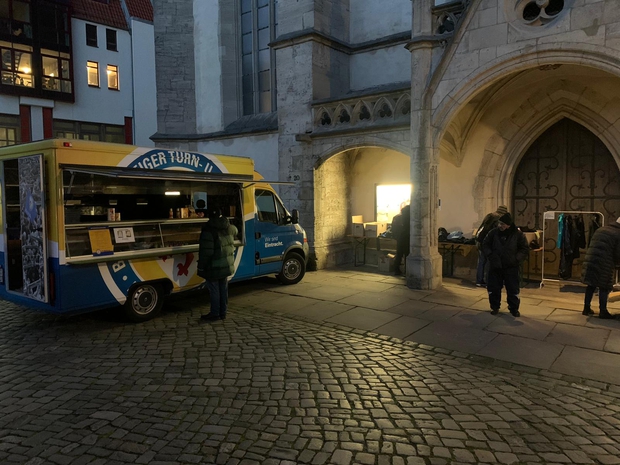 Am vergangenen Mittwoch, 23.02.2022 war der Versorgungsbus wieder an der Brüdernkirche im Einsatz. Parallel zur Unterstützung wohnungsloser und bedürftiger Menschen in Braunschweig, die nach wie vor mit einer kostenlosen warmen Mahlzeit, Heiß- und Kaltgetränken sowie Produkten der täglichen Hygiene versorgt werden, kommt nun auch in regelmäßigen Abständen der Versorgungsbus zum Einsatz. Dieser ist ausgestattet mit Kleiderspenden, wie Jacken, Pullovern etc. aber auch Decken sowie Tierfutter und weiteren (haltbaren) Lebensmittelspenden.
