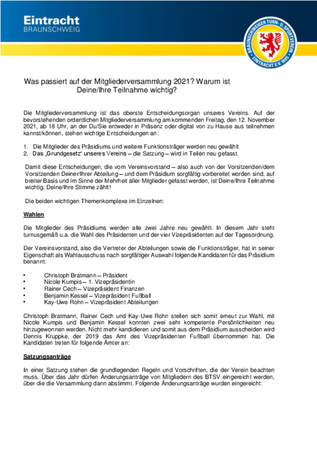 Info-Schreiben des Vereinsmanagements an die Mitglieder