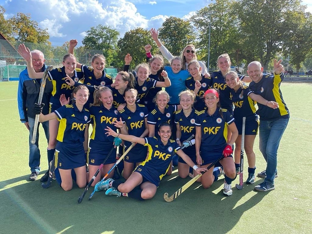 Die Hinrunde der Feldsaison 2022/2023 in der 2. Bundesliga läuft gut für Eintrachts 1. Damen. Schon vor den letzten drei Auswärtsspielen, konnten mehr Punkte gesammelt werden als in der Hinrunde der vorherigen Saison. Mit 9 Zählern und der zweitbesten Tordifferenz, befindet sich das Team momentan auf den 5. Tabellenplatz. Am letzten (Doppel-)Heimspielwochenende musste man sich am Samstag noch mit einem etwas unglücklichen 0:1 gegen Bonn zufrieden geben. Dafür starteten die Damen am Sonntag Mittag voll durch und besiegten die Aufsteigerinnen aus Essen mit einem 10:2 Kantersieg. Laura Rodrigues (vorn im Bild) erzielt dabei ihren ersten Hattrick. Mit drei Toren glänzte die 16 Jährige, die bereits ihre zweite Feldsaison bestreitet, nachdem sie im April letzten Jahres aus der WJB in den Kader kam.